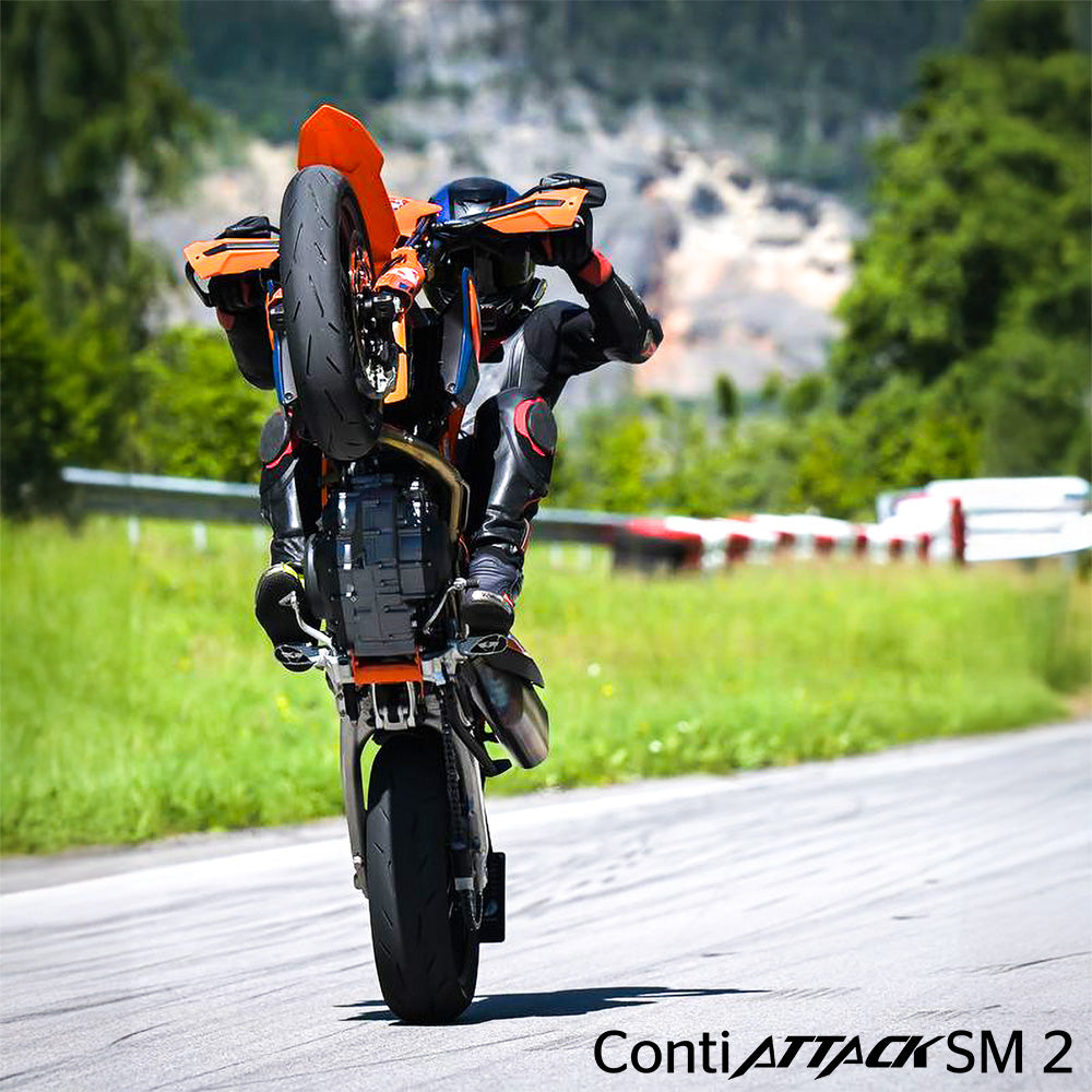The Continental ContiAttack SM2 Supermoto Tyres give performance virtually equal to Continental's most extreme DOT supermoto Tyre (the ContiAttack SM Supermoto EVO) with increase comfort, wet grip and mileage. The ContiAttack SM2 Tyres feature a tread design, tread formulation and carcass construction that rely heavily on Continental's expertise with track-only racing tyres. Large areas of slick, uninterrupted treadblock deliver the brand's signature Continental Grip Limit Feedback technology. The center section of rear tyres is engineered to handle the extreme forces and high temperatures of hard braking and acceleration - which doubles to extend tyre life when ridden on the road. Using Continental's signature BlackChili compound, the ContiAttack SM2 Supermoto Tyre is a tyre that is engineered for the supermoto riding style and track-level riding demands that still excels when ridden on the streets.