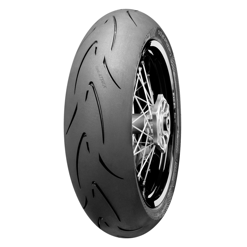 The Conti Attack Super Moto EVO tyres are an advanced high performance street legal supermoto tyre with an updated rubber compound for improved grip and extended mileage. The Traction Skin provides an extremely safe and short tyre break-in. This is possible due to the revolutionary raw tread surface, which is the result of a new mold coating technology which eliminates the need for tyre-release agents.