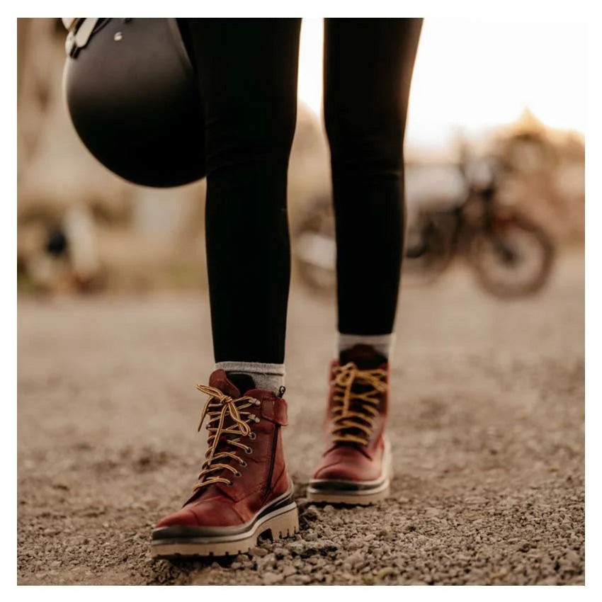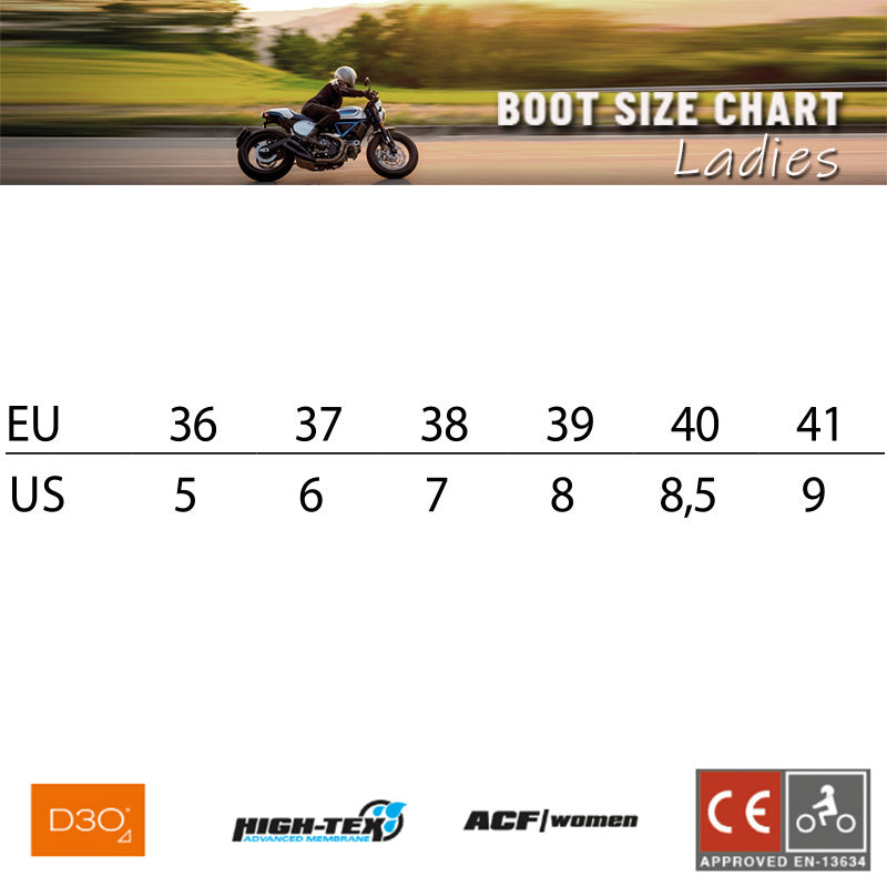 The Falco Viky is a modern womens motorcycle boot with style and protection as a given. Made from full-grain leather for enhanced abrasion resistance and a luxurious look. The High-Tex Advanced Membrane is resistant to water penetration and is certified waterproof. The D3O® Impact Protection, developed in snow sports and the military industry, was first applied to motorcycle boots by Falco. "D3O Intelligent Molcules" flow freely when moving slowly but on shock, lock together to absorb impact energy. Transmitted force to ankle cup area is significantly reduced thanks to D3O® exclusive support. The Falco Viky motorcycle shoe is specially designed for the female foot to improve comfort and durability.