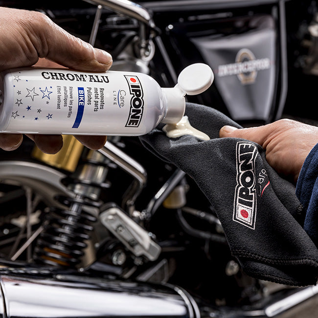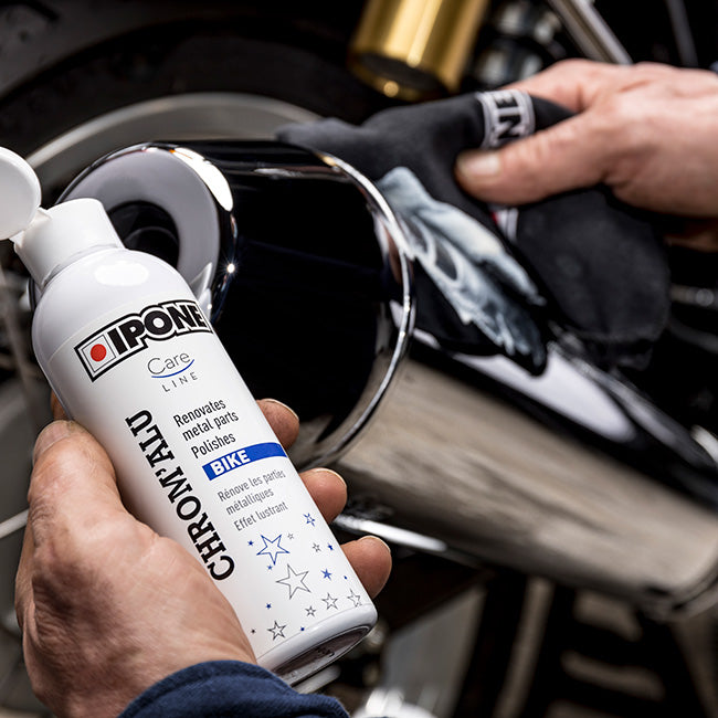 CHROM’ALU is a renovating cleaner for metallic parts. Apply a small amount of CHROM’ALU on a soft cloth and rub the area to be treated in a circular motion. Its active microbeads allow cleaning and deep polishing.