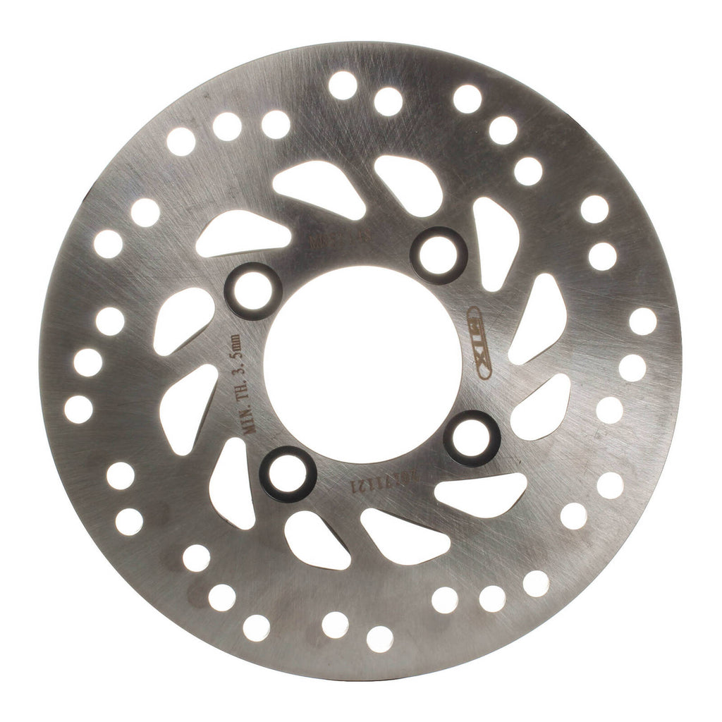 MTX solid discs are constructed using one complete segment of Japanese SUS 420 stainless steel, then heat-treated to HRC 36+-2. Lightening and drill hole patterns are as per OEM designs to improve braking performance and reduce the temperature of the disc.