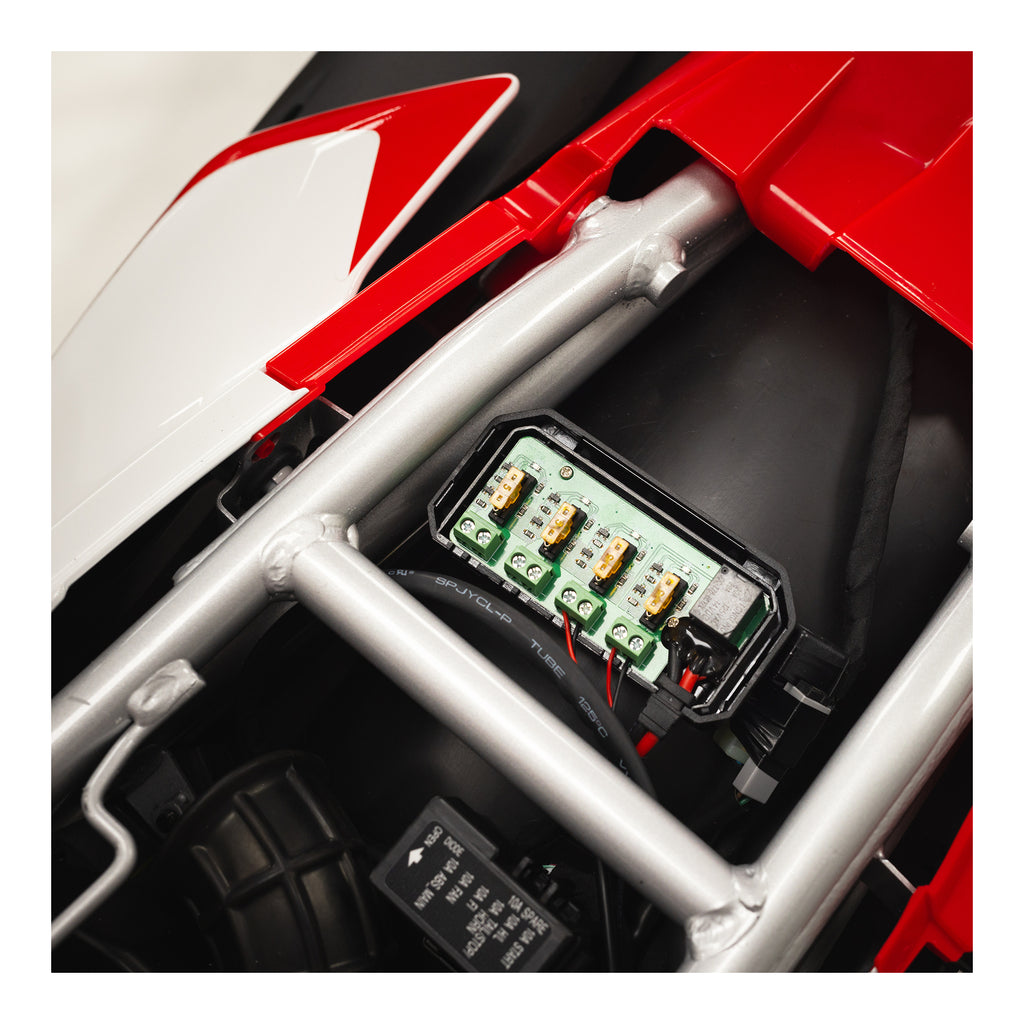 Quickly connect four electronic devices to your motorcycle without having to search for a suitable switched live feed each time. There's no need to attach multiple ring leads to your battery as this device manages them for you.
