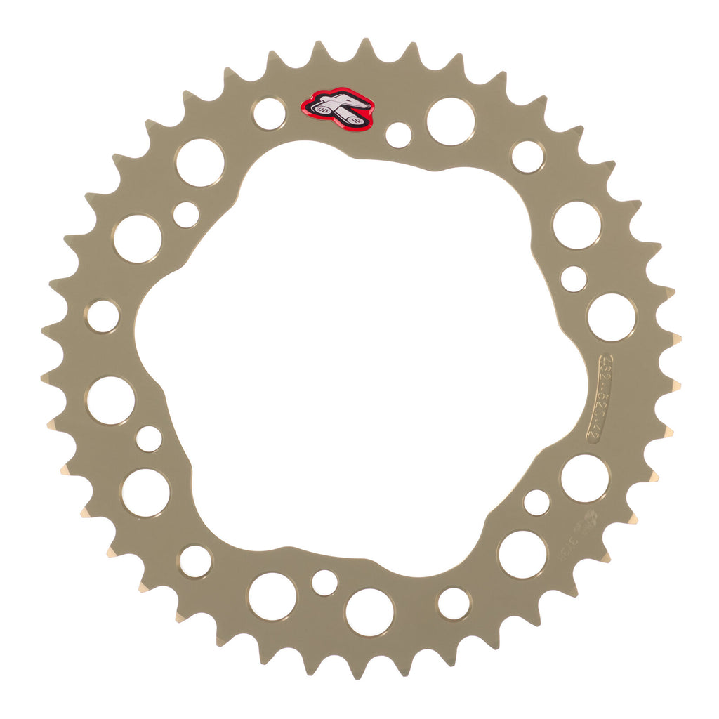 Renthal hard anodised rear sprockets are precision CNC manufactured to extremely high tolerances. The high strength is especially enhanced by using a 7075 T6 aluminium alloy coated in an ultra-hardwearing finish for extreme mileage. The rear sprockets computer-aided design gives the maximum reduction of unsprung weight at the rear wheel, to give maximum power transfer. The Renthal rear sprockets are 33% lighter than steel and the self-cleaning mud grooves prevent dirt buildup and help keep the sprocket clean.